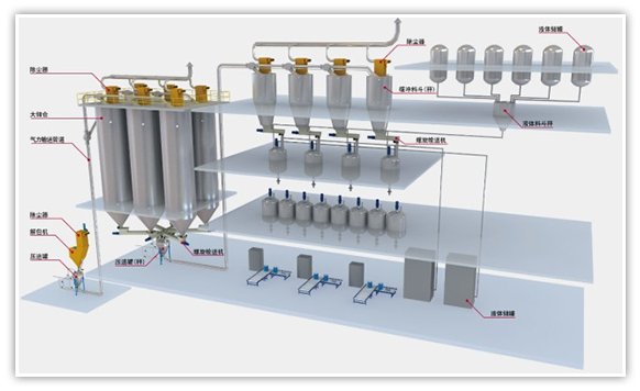 1、不同包裝形式(袋裝、太空包、槽車等)的松散物料的氣力輸送系統;